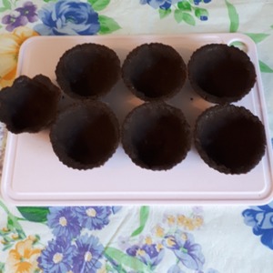 Разложить массу по формочкам, хорошо прижимая к стенкам, чтобы получилась корзинка. Поместить формочки в холодильник на 1 час. Я использовала силиконовые формочки, так как они мягкие, то сложила их по три штуки вместе.