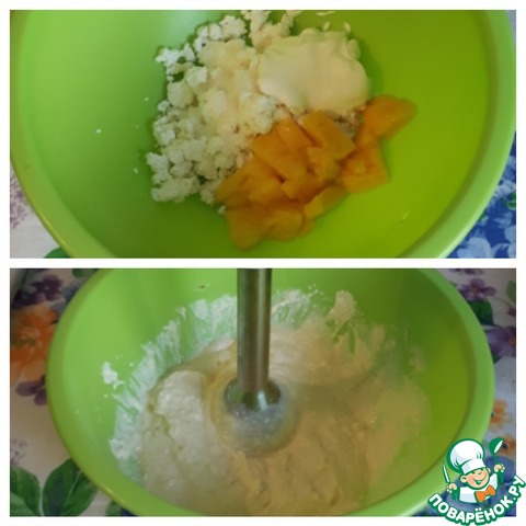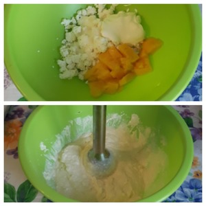 Приготовим начинку. Смешать творог, сметана, сахар, манго, ванильный сахар, все хорошо взбить погружным блендером до однородности.
