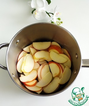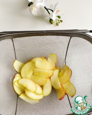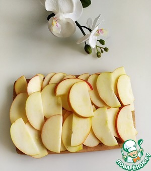 Удалить из яблок сердцевину и нарезать тонкими пластинами.