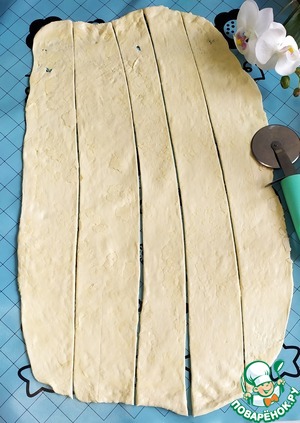 Силиконовый коврик смазать растительным маслом. Раскатать тесто. Порезать на полоски шириной 5-6 см.