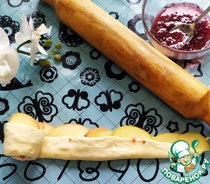 Край полоски по всей длине смазать вареньем. Сверху слегка посыпаем крахмалом (крахмал забирает лишнюю жидкость, а на вкус булочек никак не влияет.) Выложить яблоки на край полоски теста с отступом. Снова немного присыпаем крахмалом.