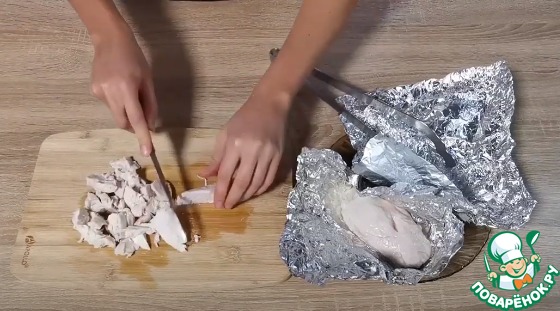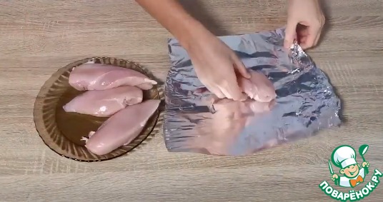 Оборачиваем куриное филе в фольгу и запекаем при 180 С в течение 30-40 минут.