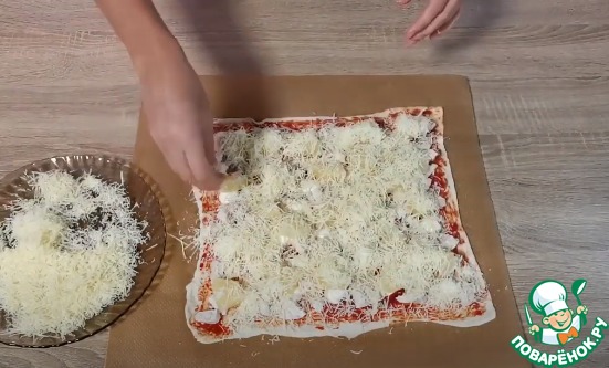 Выкладываем на тесто поочередно: моцареллу, куриное филе, ананас, сверху посыпаем твердым сыром.