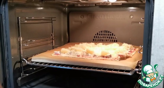 Кладем пиццу на прогретый пекарский камень и запекаем при 200 С в течение 15-20 минут.