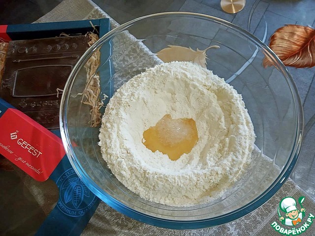 Просеиванием муку в миску, делаем углубление и добавляем соль и растительное масло.