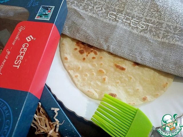 Готовый лавашик выкладываем на блюдо, смазываем чуть водой с помощью кисточки и прикрываем салфеткой. Так они останутся мягкими.