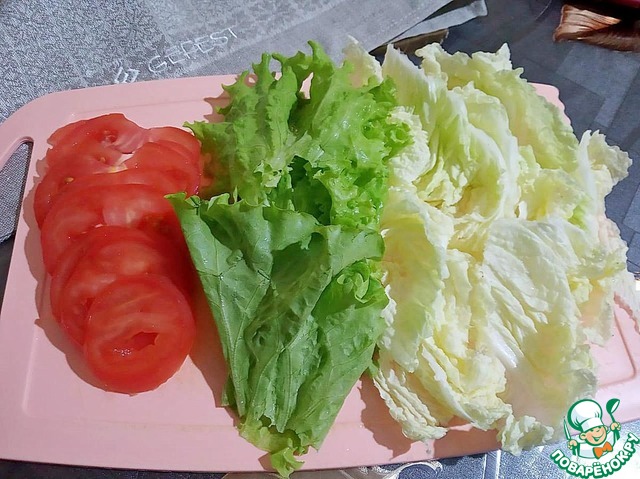 С листьев пекинской капусты срезаем жёсткую часть. Помидоры нарезаем тонкими кружочками.