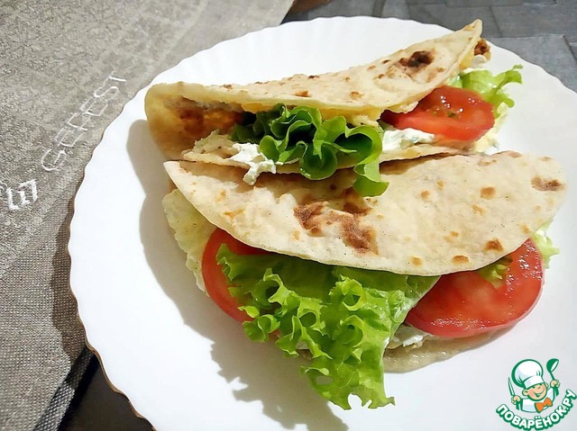 Выкладываем сверху помидоры и прикрываем второй половинкой лавашика.
