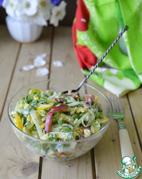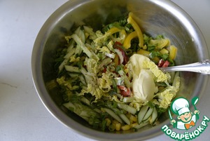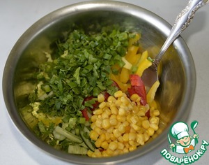 Смешиваем все составляющие салата, добавляем консервированную кукурузу, рубленную кинзу и зелёный лук.