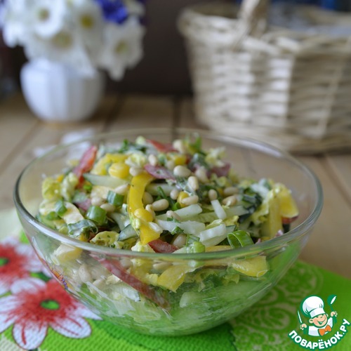 Как и все майонезные салаты, подаём охлаждённым. При подаче посыпаем обжаренным на сухой сковороде кедровым орехом.