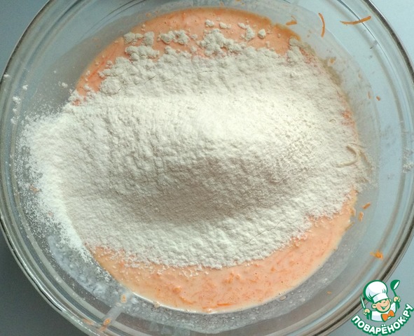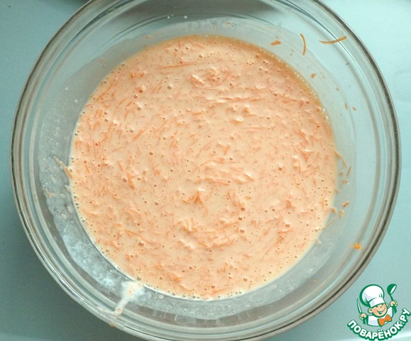 Затем добавить растопленное сливочное масло и морковь, натёртую на мелкой тёрке.