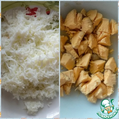 Яйца отварить, почистить, белок я натёрла на мелкой тёрке, а желтки крупно порезала.
