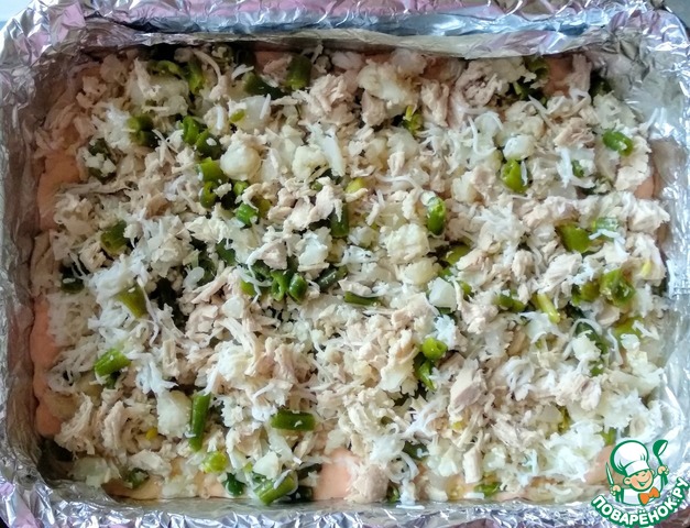 Форму для выпечки при необходимости застелить бумагой для выпечки или фольгой, смазать растительным маслом (1 ст. л.). Выложить чуть больше половины теста в форму. Сверху распределить фасоль, белок, курицу и порезанную цветную капусту.