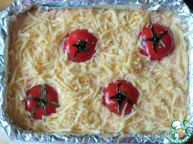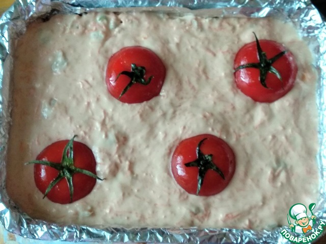 Сверху вылить оставшееся тесто. Распределить помидоры черри. У меня обычные небольшие помидоры, которые я разрезала вдоль пополам и украсила верхушками.