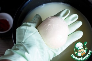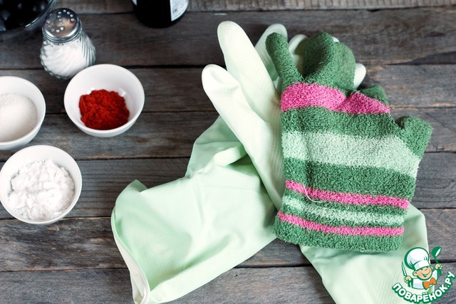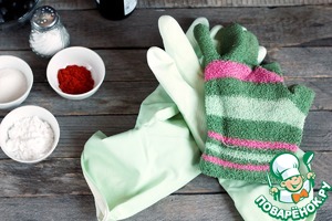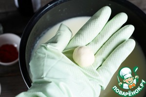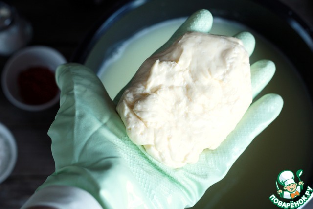 Чтобы не обжечь руки, так как работать придется, погружая руки в горячую сыворотку, потребуются резиновые перчатки, под низ которых необходимо ещё надеть тканевые (у меня лёгкие вязаные), что сделает процесс приготовления комфортным. Размер резиновых перчаток стоит подобрать так, чтобы они не были очень велики с учетом тканевых. Свободная часть зоны пальцев может затруднять процесс при отсутствии опыта.