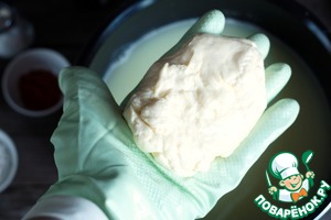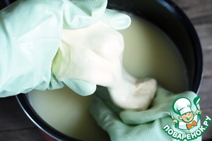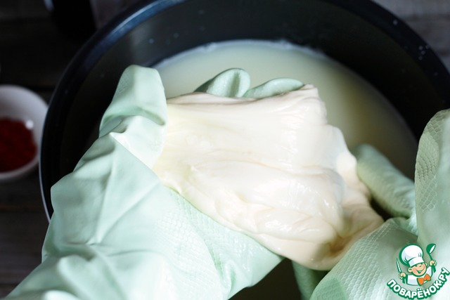 Погрузить кусочек в горячую сыворотку, выждать секунд 10 и начинать его сначала разминать, а далее растягивать и складывать пополам, снова растягивать и складывать, повторяя операцию. Если чувствуется, что масса сильно плавится, то вынуть и продолжать процедуру вне сыворотки. При остывании снова погрузить. Это чувствуется через перчатки, не смотря на их толщину, и по процессу растягивания.
