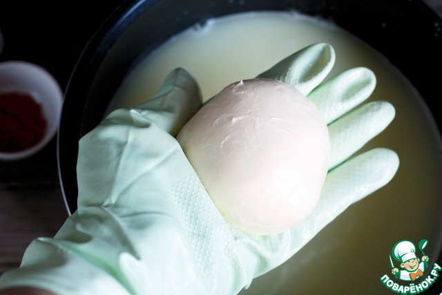 Когда масса станет вся эластичной, а не отдельные ее участки, сформовать сырный шарик. Чтобы его поверхность была более равномерная, формуется он по принципу натягивания, проталкивая его между большим и указательным пальцем, будто надувается мыльный пузырь. Домашний сыр "Моцарелла" готов.