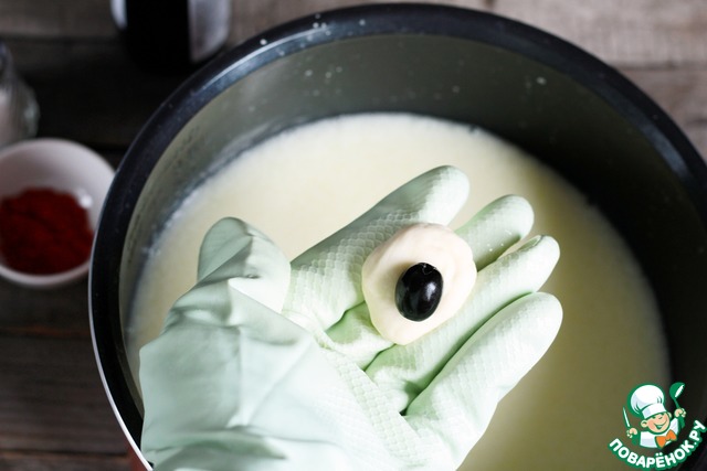 Для приготовления закуски, минуя рассол, продолжить процесс плавления в той же сыворотке. Для этого нарезать моцареллу на кусочки (у меня получилось 26 шт.). Каждый опускать в горячую сыворотку на секунды для расплавки, сделать лепешку и завернуть в нее оливку, собрав в узелок.
