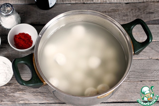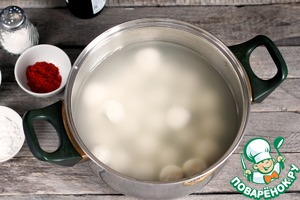 Опускать готовые шарики сразу в заранее вскипяченную и хорошо охлажденную воду (1 литр) без соли. Оставить их в ней еще минут на 10. Вынуть, давая стечь воде, выложить на тарелку в один слой и отправить в холодильник.