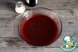 Для соуса смешать паприку сладкую молотую, крахмал картофельный, сахарный песок и соль, залить вином красным сухим или соком и проварить до консистенции киселя. Соус не должен быть слишком густым, но и не должен при этом слишком течь. Очень удобно готовить в микроволновой печи, перемешивая венчиком каждые полминуты. При максимальной мощности 800 Вт потребовалось 2,5 минуты. Соус остудить при комнатной температуре, перемешивая, чтобы не образовалась корочка, либо накрыв в касание пищевой пленкой.