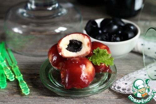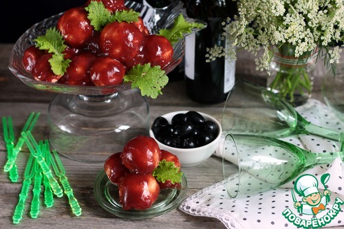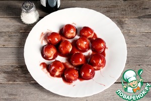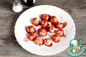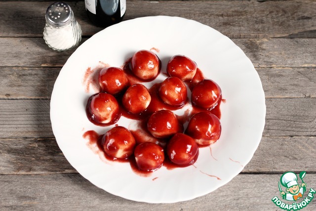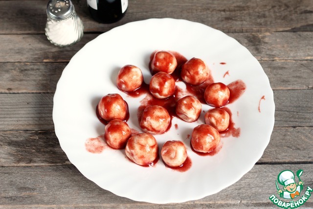 Если какое-то количество соуса стечет, то шарики аккуратно перенести на другое блюдо при помощи зубочистки, а соус собрать и распределить между шариками. Оставить в холодильнике до утра. За это время вино потеряет свою резкость и оставит тонкие приятные нотки. Если какое-то количество соуса все же стечет, то покройте этими остатками шарики при подаче.
