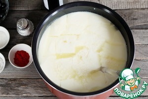 5. Небольшое количество сырной массы, чтобы не возиться с горячей сывороткой или водой, удобно плавить в микроволновке.