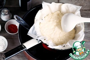 Откинуть сырное зерно на дуршлаг, застеленный не плотной тканью, можно марлей в 2 слоя, либо мелкое сито. Масса становится единой сырной "головкой". Сыворотку сохранить и вернуть в чашу мультиварки.