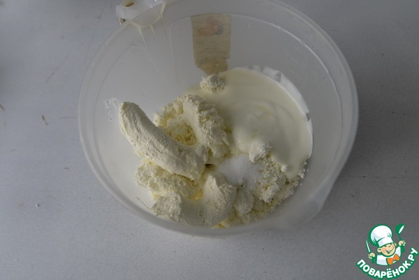 Соединяем творог, сливки, йогурт, сахар, ванилин. Пробиваем блендером до однородности.