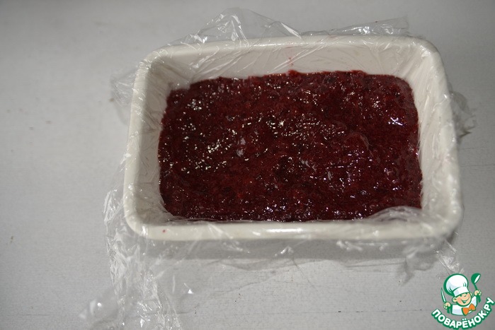 Небольшую форму застилаем плёнкой, выливаем вишню с желе. Ставим в холодильник для полного застывания. Если необходимо быстро, то ставим в морозилку.
