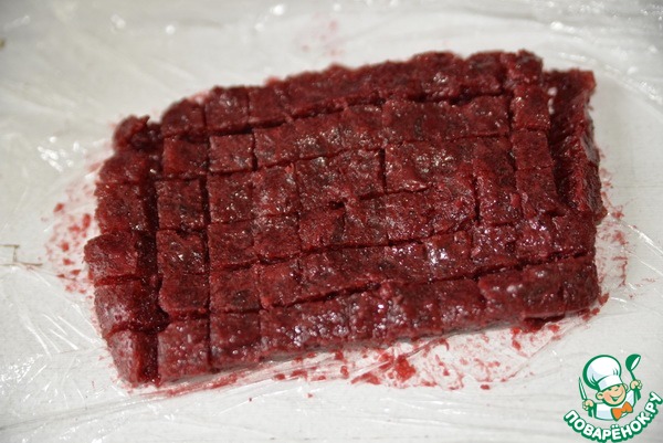 Застывшее вишнёвое желе достаём из холодильника, режем на кубики.