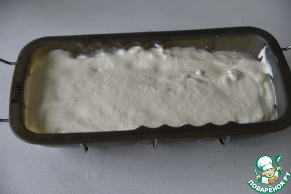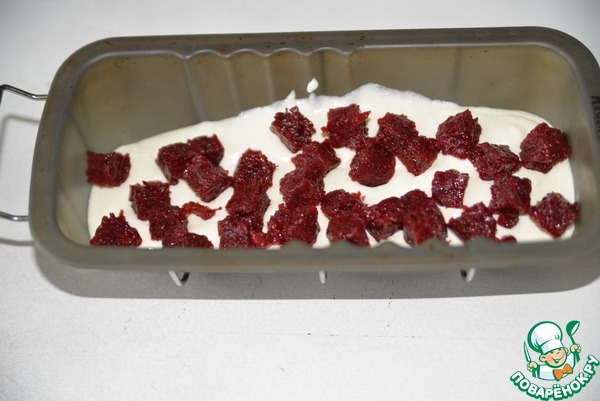 Берём удобную форму. Наливаем половину творожного мусса. Кладём кусочки (кубики) вишнёвого желе.