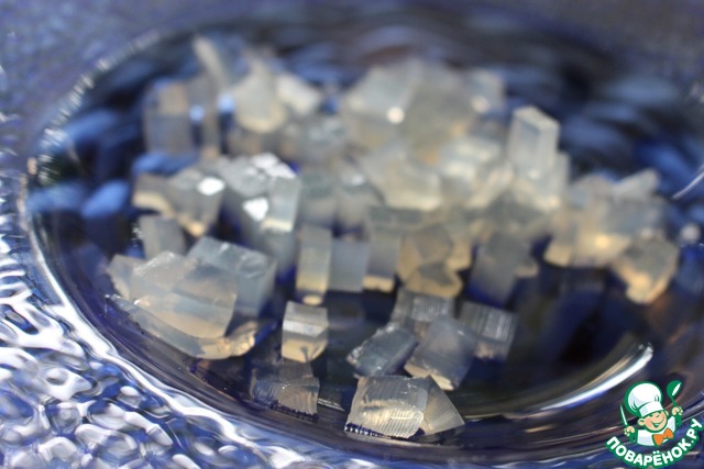 Переливаем в форму, даем полностью остыть при комнатной температуре и помещаем минут на 10 в холодильник. После охлаждения нарезаем на кусочки произвольной формы. (Солевых призм получается больше, чем надо для рецепта; их можно использовать с другими блюдами).