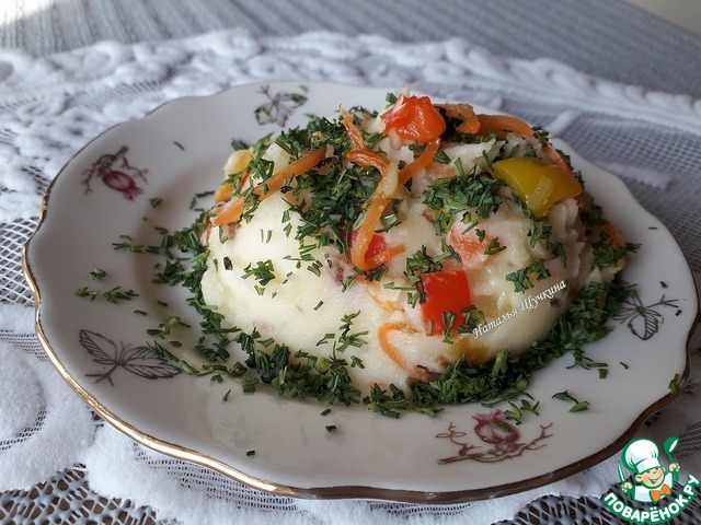 Когда картофель сварится, слить всю жидкость и в горячий картофель засыпать все заготовки плюс около 50-70 граммов масла, можно по желанию и больше. Поперчить, посолить, перемешать всё и немного примять - только не до состояния пюре
