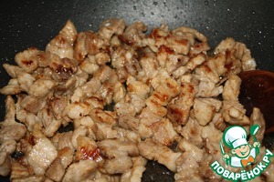 Разогреть сковороду с маслом и обжарить мясо до золотистого цвета.