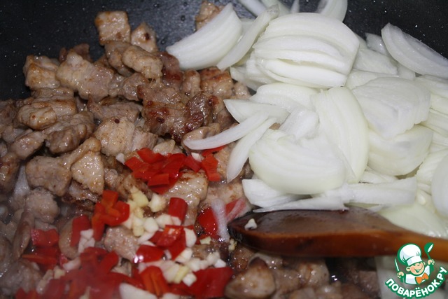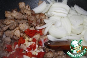 Добавляем к мясу, сыпем щепотку сахара и обжариваем около 5 минут.