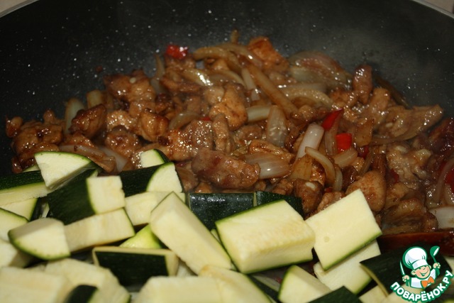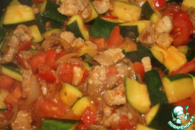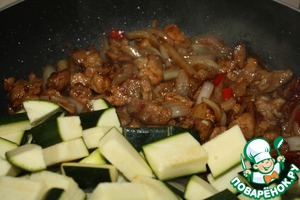 Добавляем кабачки и обжариваем все вместе около 6 минут.