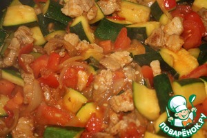 Добавляем к мясу, обжариваем до мягкости томатов.