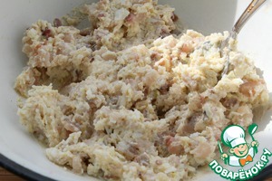 Селедку порезать очень мелко, добавить к сыру и яйцам. -