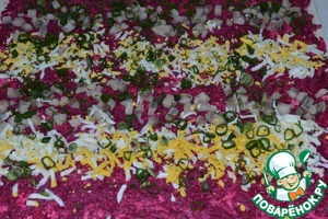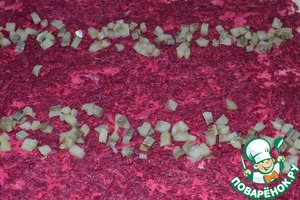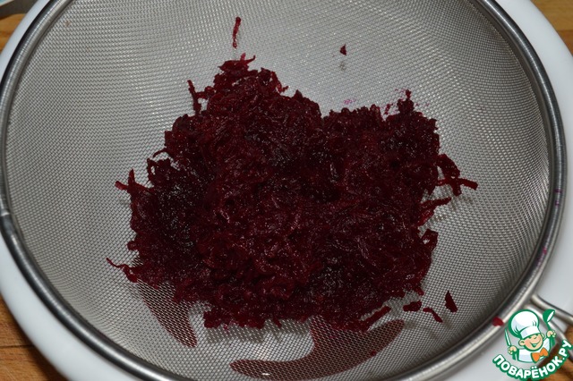 Свеклу натереть на мелкой терке, откинуть на сито, чтобы стек лишний сок.