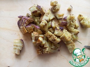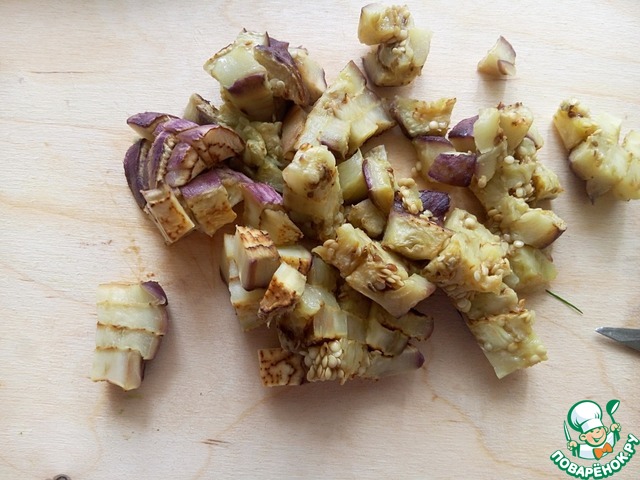 Баклажаны вымыть, обсушить и запечь целиком на сухой сковороде или конфорке до готовности, затем очистить от кожицы и порубить мякоть ножом.