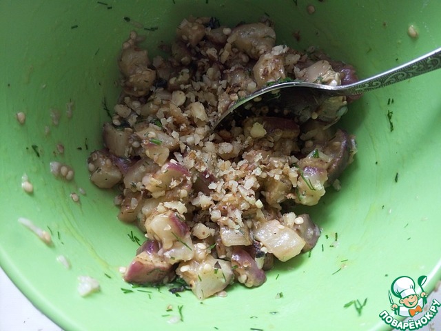 Добавить к баклажанам измельчённый чеснок, рубленые грецкие орехи и зелень (половину отложить для украшения), влить половину заправки и перемешать.