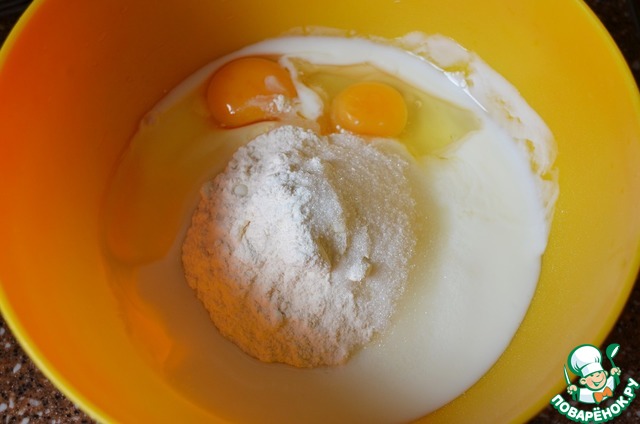 В просеянную муку добавить кефир, яйца, сахар. Размешать.