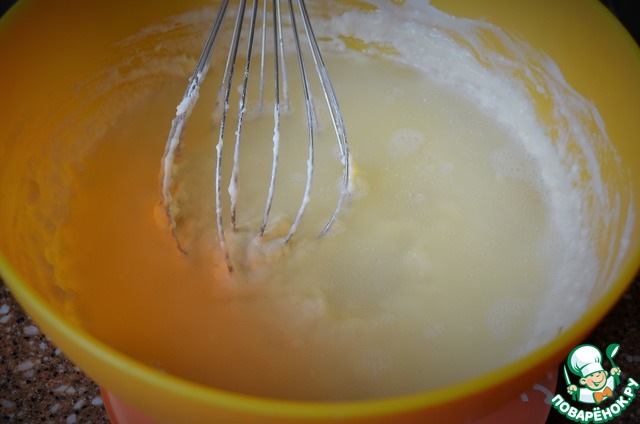 Влить масло, добавить соду. Ещё раз тщательно взбить.