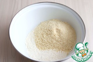 В миске соединить сухие ингредиенты: муку (120 гр.), сахар (50 гр.), миндальную муку (70 гр.).