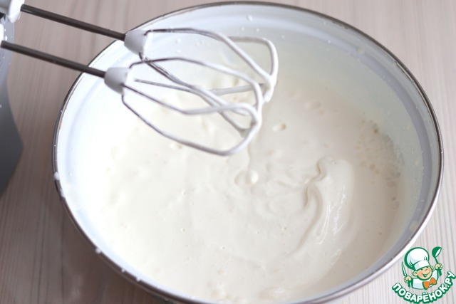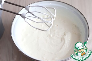 Сливки (500 мл.) взбить на средней скорости. После того, как на поверхности крема будет образовываться четкий след от венчика миксера, добавить в сливки лимонный сок (2 ст. ложки), добавить 50 гр. сахарной пудры. Далее взбивать сливки до необходимой плотности, затем добавить раствор желатина. Крем хорошо перемешать.
