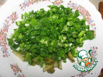 Нарезать всю зелень и чеснок.