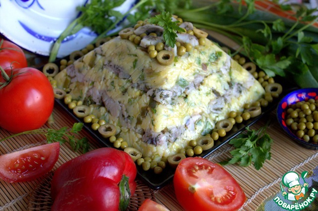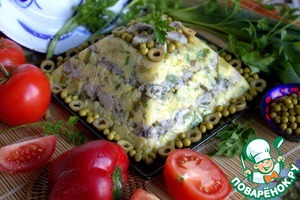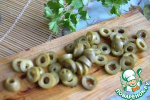 Для украшения взяла оливки, нарезала колечками. Я беру в пакетиках по 100 г во время акции, это очень удобно, пересыпал и подал на стол на ужин, не надо держать открытую банку в холодильнике.