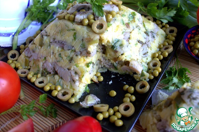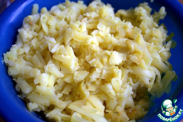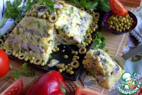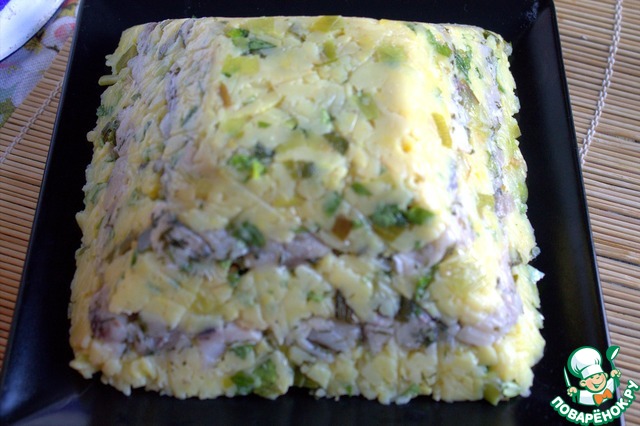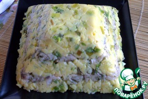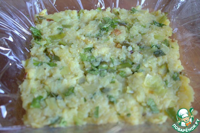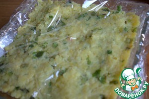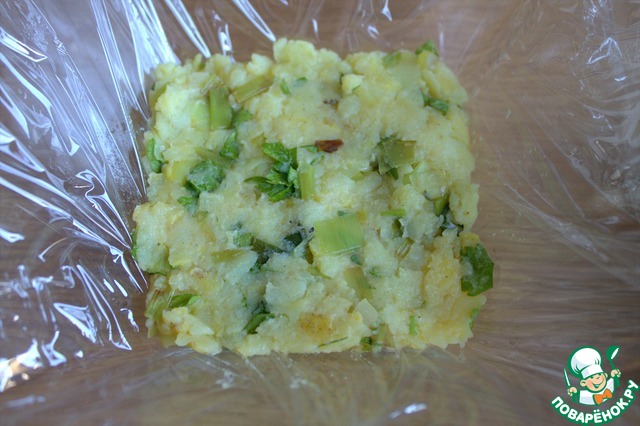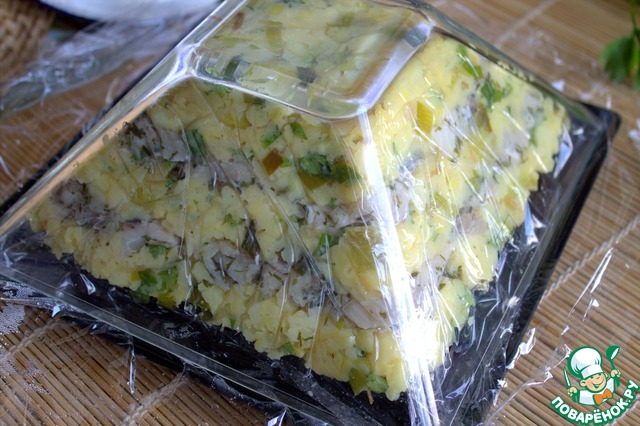 Форму застелить пищевой плёнкой. У меня стеклянная салатница в виде пирамиды. Утрамбовать слой картошечки.