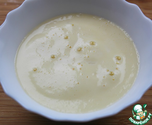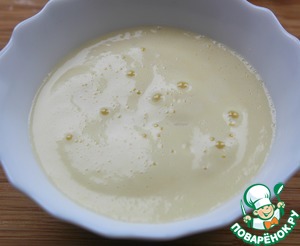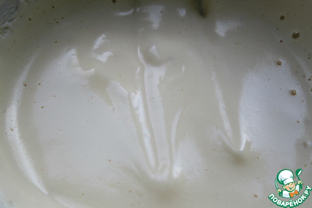 Влить тонкой струйкой в желтковую массу, непрерывно мешая.
