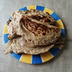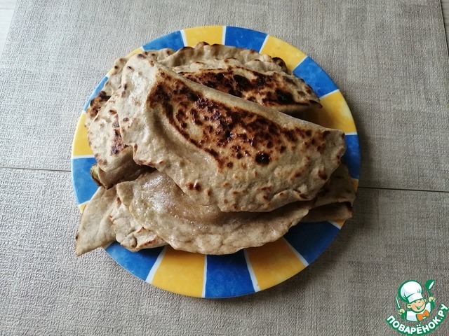 3 вариант. Из последнего куска теста раскатать тонкий пласт и свернуть рулетом по принципу первого варианта, только не выкладываем начинку. Так же разрезать рулет на порционные кусочки и каждый кусочек раскатать очень тонко в лепешку.